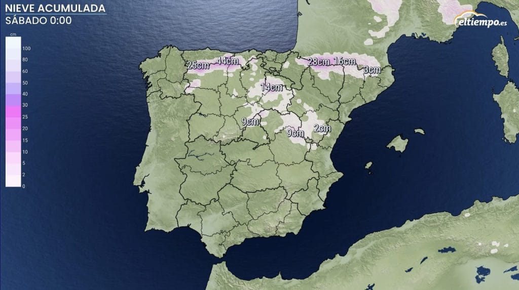 Las acumulaciones más importantes de nieve las van a experimentar en la cordillera Cantábrica y sobre todo en los Pirineos, con cerca de 30 centímetros adicionales de nieve. También se espera algo en la zona del alto Ebro, en las sierras entre Madrid y Castilla y León y en zonas de las provincias de Cuenca y Teruel.