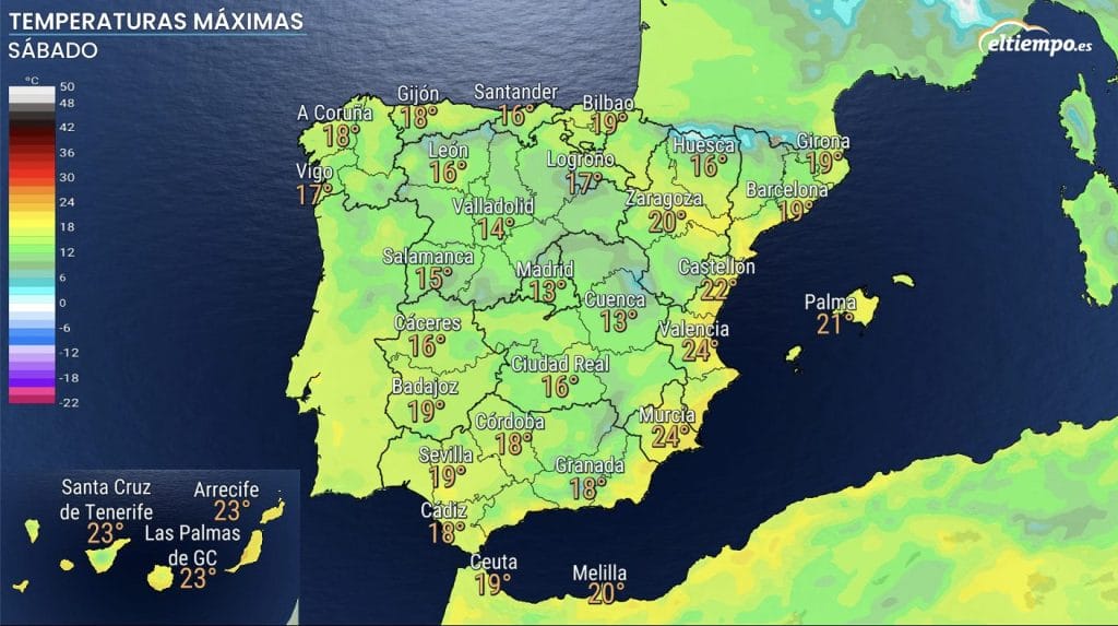 Las máximas el sábado se disparan en el Mediterráneo con valores cercanos a los 25 grados en zonas de Valencia, Alicante y Murcia. En el resto, las temperaturas serán suaves, con valores más cerca de los 15 a 20 grados incluso en el extremo norte de la península, donde podrían llegar a los 20 grados.