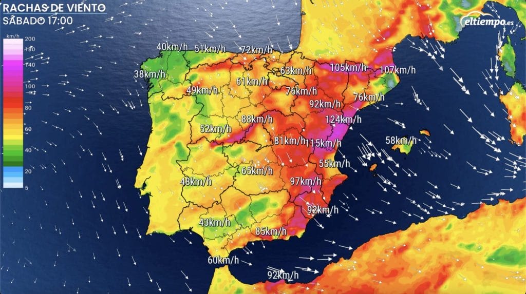 Las rachas más intensas se esperan en la mitad este peninsular, pero puntualmente también en zonas del norte. Se podrán superar los 100 kilómetros por hora en el valle del Ebro y en zonas tanto de la costa mediterránea como de alta montaña en los Pirineos y el Sistema Ibérico.