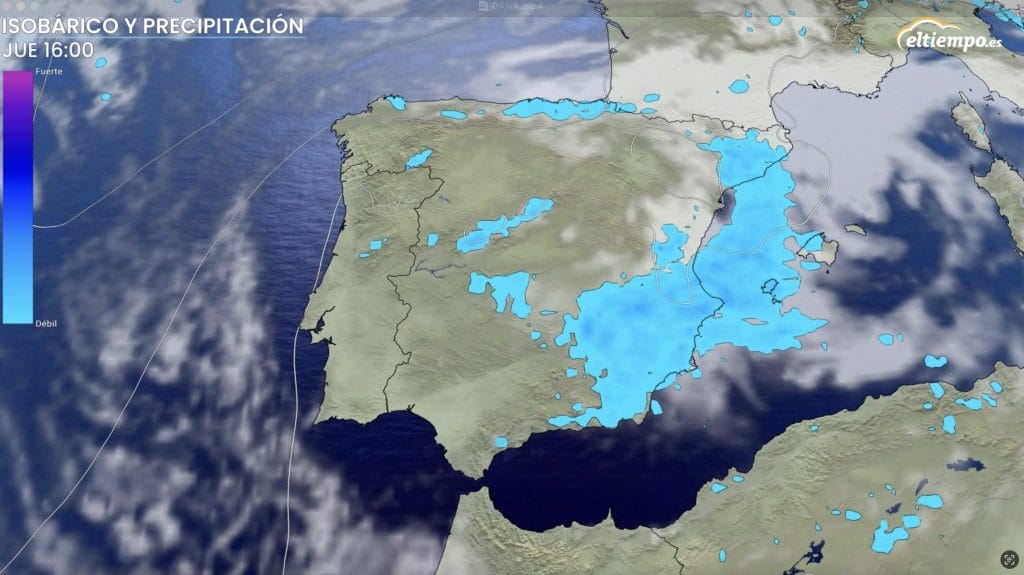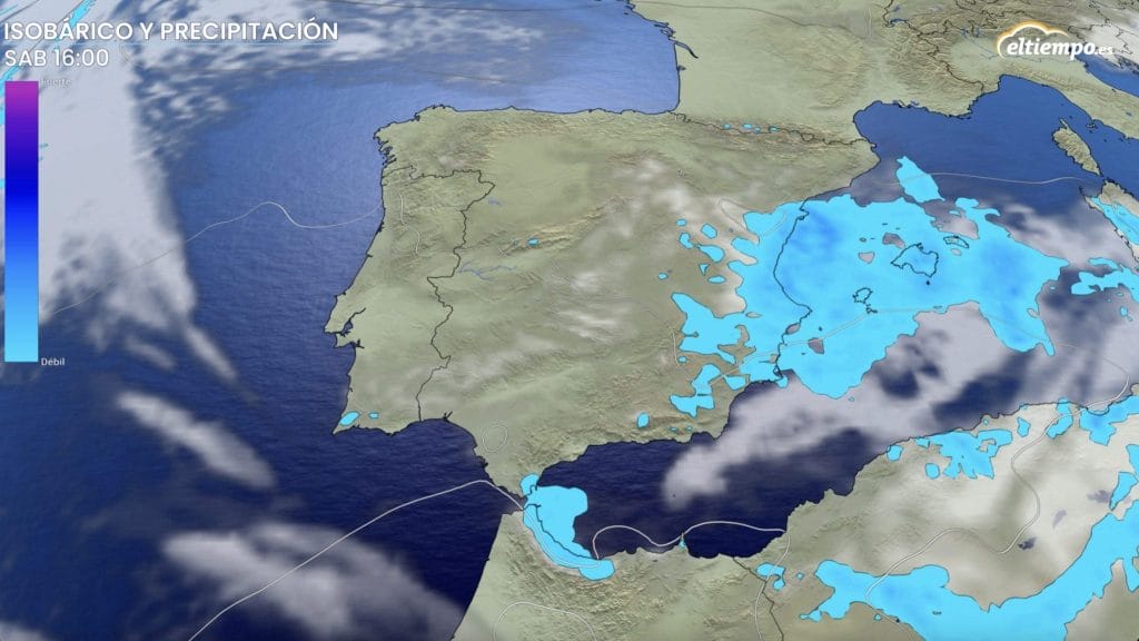 Las precipitaciones seguirán afectando al arco Mediterráneo pero serán más puntuales y aisladas. También se esperan algunas precipitaciones en el este de Castilla-La Mancha y el sur de Aragón.