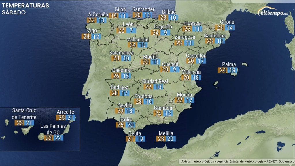 Las máximas del sábado ya se quedan por debajo de los 30 ºC, aunque en algunas capitales del sur sí rondarán esa marca. Ambiente mucho más fresco en la vertiente mediterránea con el viento, la lluvia y la abundante nubosidad. En general, el ambiente este fin de semana va a ser mucho más otoñal, con temperaturas mínimas más frescas.