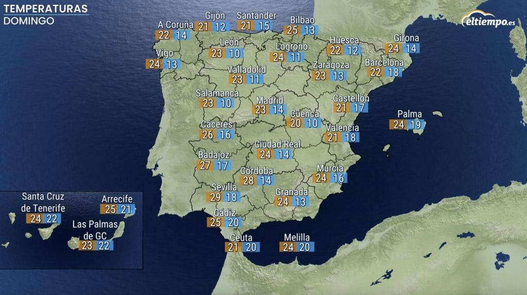 El domingo sí se espera un aumento térmico en el norte con máximas unos grados más altas, aunque dentro de los valores propios de estas fechas. Las temperaturas mínimas podrían ser algo más altas, aunque en bastantes capitales, sobre todo de ambas mesetas, se quedarán cerca de los 10 ºC.