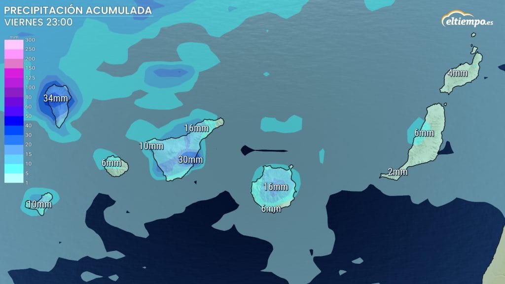 Un frente asociado cruzará Canarias con precipitaciones que pueden ser más fuertes en La Palma, El Hierro y La Gomera. Este frente entrará al final de la tarde por el Golfo de Cádiz y las lluvias avanzarán por el suroeste hacia la zona centro.