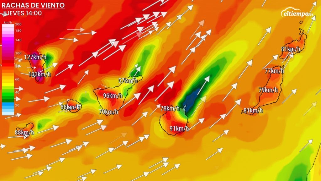 Además de las lluvias, el viento del sur-suroeste será intenso. En Canarias el jueves las rachas pueden superar los 70-120 km/h y en las costas puede dejar olas de más de 4-5 metros. Avisos amarillos y naranjas en Canarias por las fuertes rachas de viento y temporal marítimo.