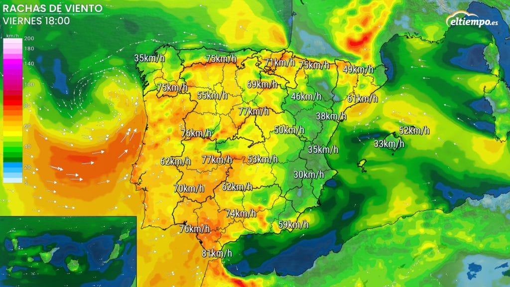 En la península sobre todo se notará el viernes, con rachas en amplias zonas del país de más de 70-90 km/h, que serán más fuertes en zonas expuestas de la Cantábrica, Sistema Central y oeste de Andalucía.