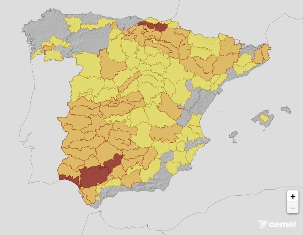En el norte también se han activado avisos de este nivel, en el interior de Guipúzcoa y Vizcaya, por máximas de 40 °C.