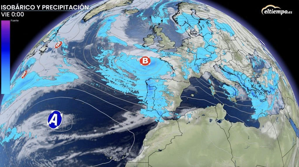 Lluvia y nieve llegando por el oeste peninsular y avanzando hacia el Mediterráneo hasta que cambie la situación el fin de semana que viene y nos encontremos con una situación más de noroeste que de oeste.