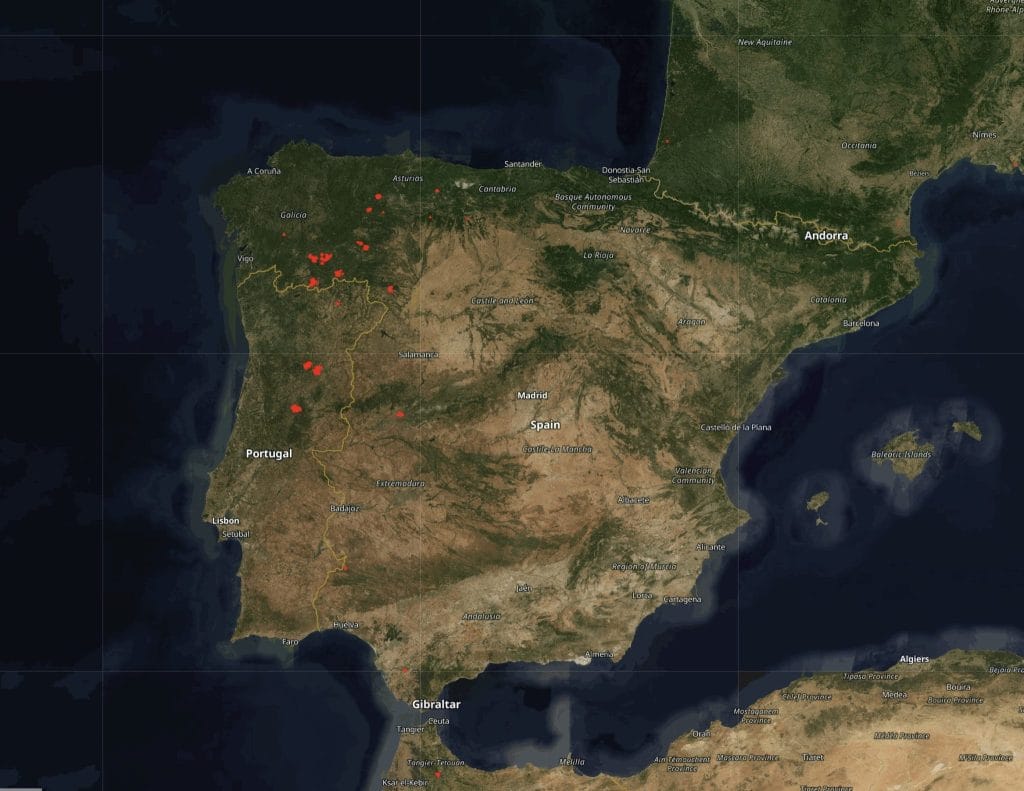 En Galicia, el incendio de Chandreja de Queija (Ourense) continúa activo con especial intensidad. Ha calcinado más de 13.800 hectáreas, con varios focos fuera de control, entre ellos Requeixo (≈ 4.500 ha), Parafita (≈ 1.800 ha), Maceda (≈ 1.700 ha) y A Mezquita (≈ 2.000 ha).