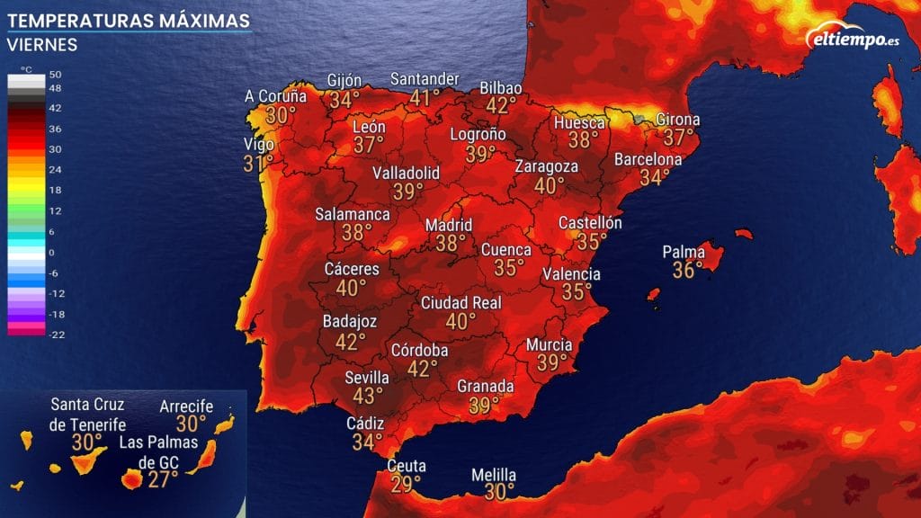 El viernes el calor se intensificará notablemente en el Cantábrico, donde ciudades como Bilbao, Santander, Oviedo o San Sebastián podrían llegar o superar los 40 °C, un hecho excepcional para esta región. El calor también se extenderá al interior y noreste peninsular, con registros de 42-43 °C en el valle del Guadalquivir.