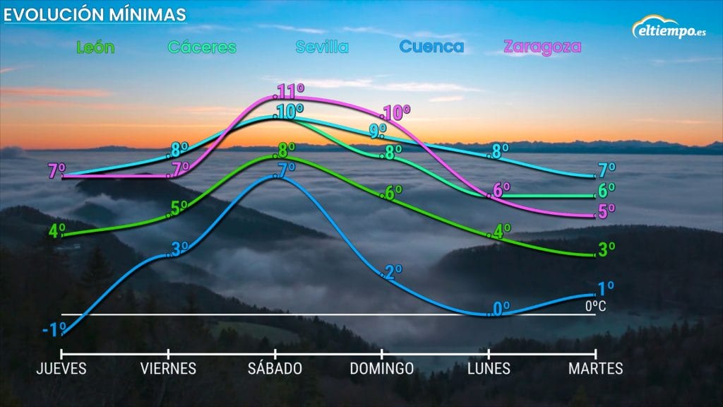 Hablaremos de registros por encima de la helada en la práctica totalidad del país. En muchos casos, las mínimas rondarán o superarán los 5ºC, lo que son valores bastante suaves para esta época, especialmente en ciudades del interior.