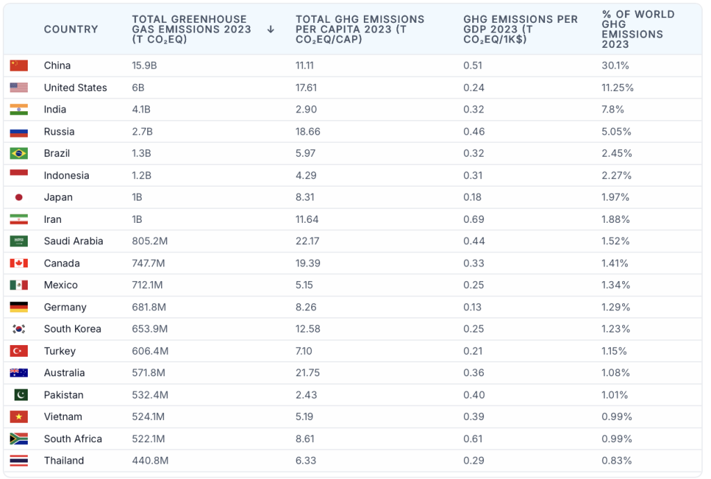 En los últimos años, según estimaciones recientes, China, Estados Unidos, India, la Unión Europea, Rusia y Brasil han representado una parte significativa de las emisiones totales del planeta. Estos grandes emisores, en conjunto, explican más de la mitad de los gases de efecto invernadero emitidos a escala global, impulsados por la industrialización, la energía basada en combustibles fósiles y el transporte intensivo.