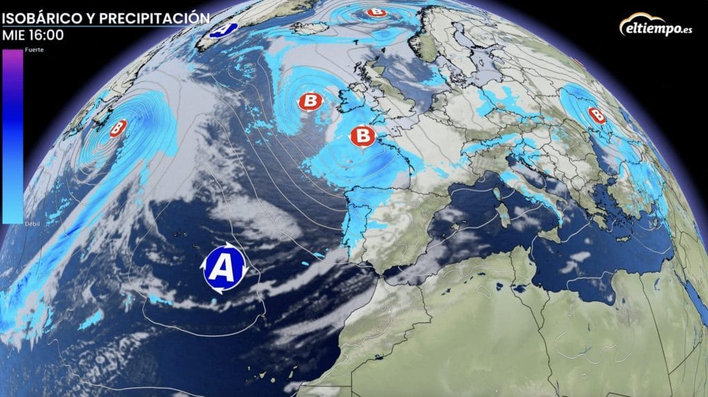 A lo largo de la semana se espera la llegada de nuevos sistemas frontales, aunque esta vez, siendo una situación de noroeste, casi todo lo que llegue en forma de precipitación lo hará por el cuadrante noroccidental de la península.