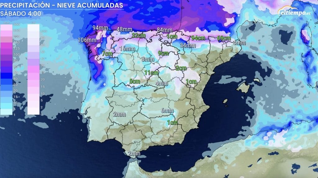 También se esperan acumulaciones en forma de nieve en los sistemas Central e Ibérico y tímidamente en zonas del Penibético y otras sierras del este de Andalucía, aunque en cotas más altas.