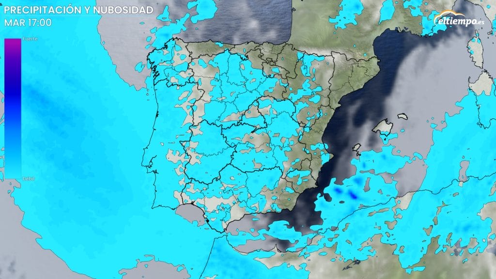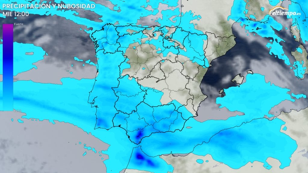Las lluvias serán especialmente intensas durante las primeras horas del miércoles en Andalucía, donde se esperan fuertes acumulados. El frente también reactivará las precipitaciones en el resto de la península y parte de Baleares, menos en Cataluña.