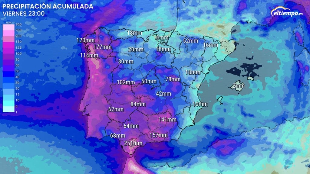 Los acumulados podrán superar la cifra de 250 mm en regiones como Cádiz. En el oeste de Galicia, se llegarán a superar los 150 mm acumulados.