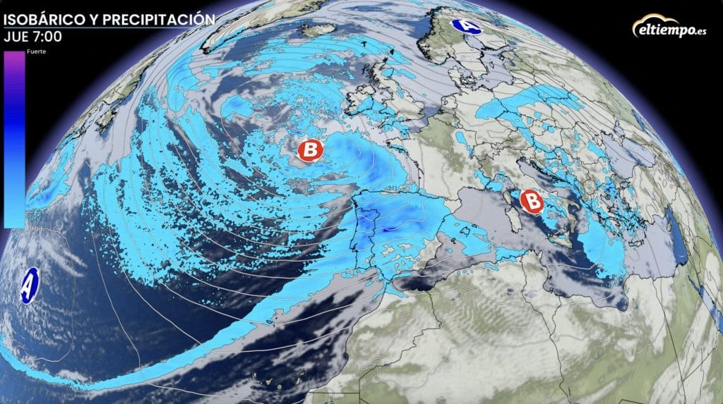 El Atlántico vuelve a marcar el tiempo en España con frentes muy activos, lluvias copiosas en el oeste, nieve en montaña y viento fuerte.