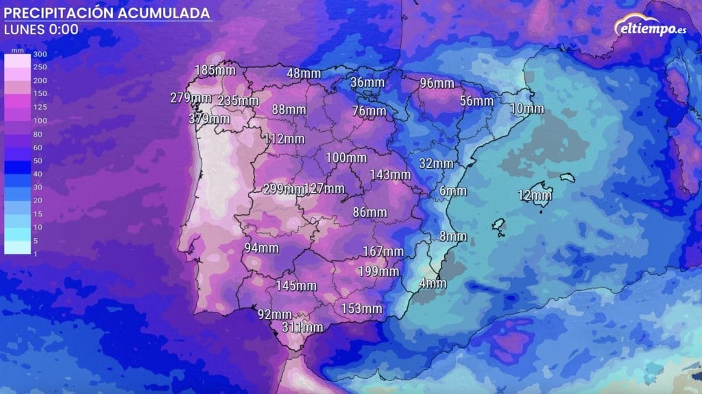 Entre este domingo y el domingo de la semana que viene, algunas zonas de Galicia van a acumular más de 400 litros, aunque en amplias zonas de esa comunidad, Castilla y León, Extremadura, Andalucía y Castilla-La Mancha se va a romper la marca de los 100 litros.