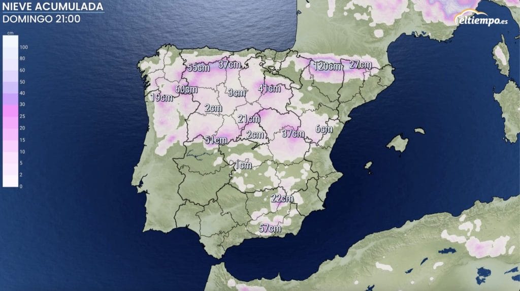La cota de nieve, que inicialmente será alta, irá bajando el martes hasta cerca de los 900 a 1.000 metros en muchas zonas de la mitad norte peninsular. Volverá a subir a mediados de semana a los 1.500 metros o más en muchas zonas para luego volver a bajar durante la recta final de la semana.
