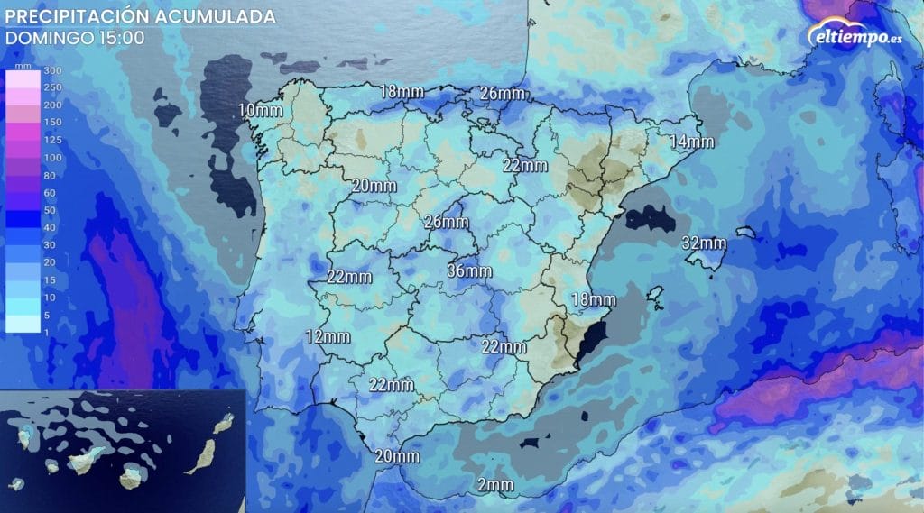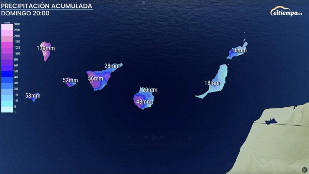 A parte de viento y oleaje la potencial borrasca Therese también trae una buena dosis de precipitaciones que serán más copiosas en islas como La Palma y Tenerife, aunque llegarán a muchas otras zonas del archipiélago.