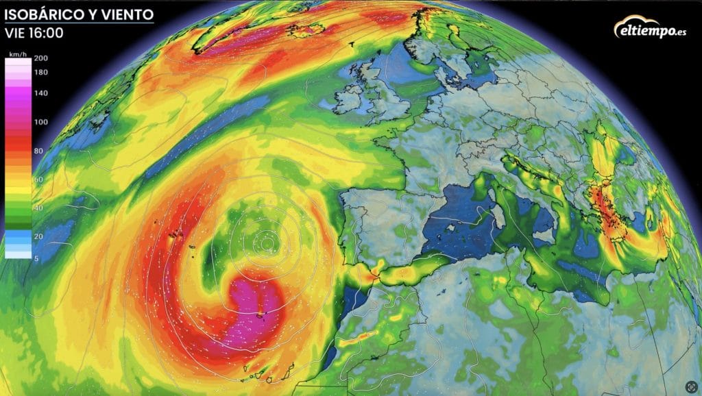 Habrá que esperar a ver cómo evoluciona la borrasca a lo largo de la semana. Con las predicciones del modelo europeo ECMWF de momentoentre jueves y domingo, dada la proximidad y tamaño de esta borrasca, el temporal de viento y oleaje será intenso en todas las islas.