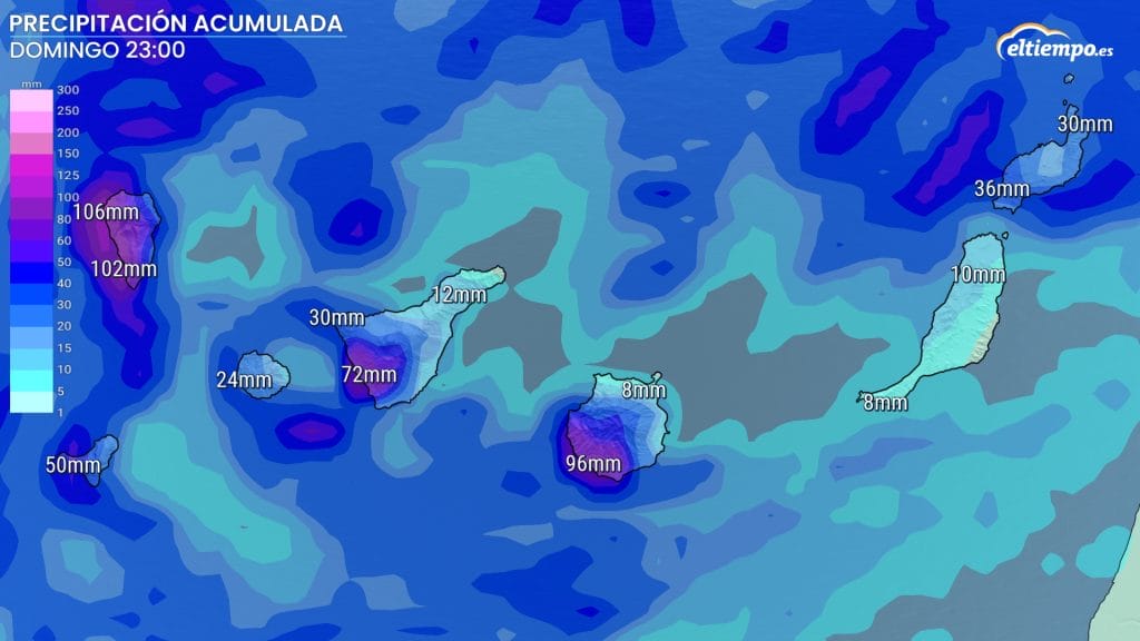 Pueden ir acompañadas de tormentas y ser persistentes, sobre todo en La Palma. De esta manera, se activa el aviso naranja en La Palma, por acumulados de más de 100 mm en 12 horas y de 30 mm en 1 hora.