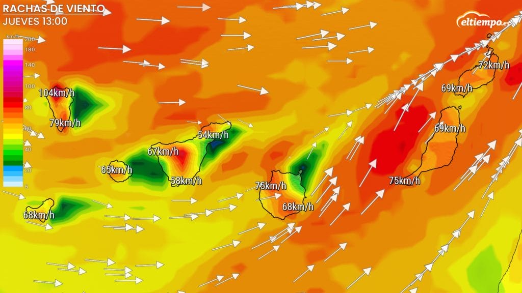 Tanto este miércoles como el jueves, las zonas más afectadas serán las zonas expuestas de medianías y cumbres. Podrán superar los 70-90 km/h en La Palma, La Gomera, El Hierro y en casi toda la isla de Tenerife. En El Teide no se descarta superar los 100 km/h.