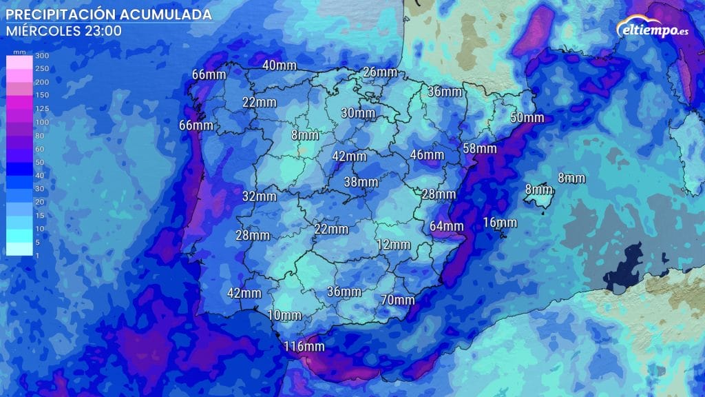 En todo el episodio, los acumulados de lluvia podrían superar los 20 a 30 mm en zonas del suroeste, oeste e interior peninsular. En el este se darían los mayores acumulados, sin descartar cantidades superiores a 60 a 80 mm desde el domingo por la tarde.