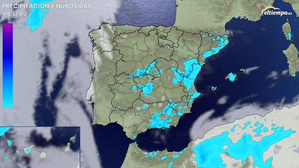El viernes se repetiría la situación. Durante la tarde comenzarían a formarse chubascos y tormentas aislados y en general débiles en puntos del este peninsular, Baleares y también en la zona centro.