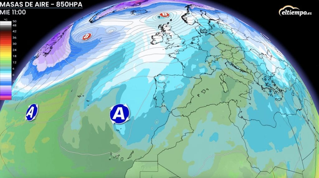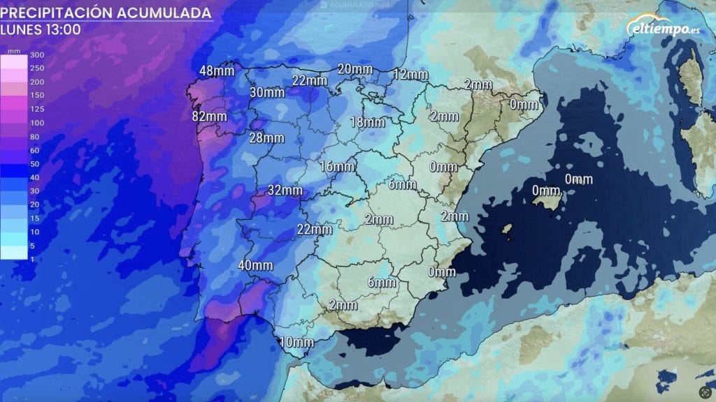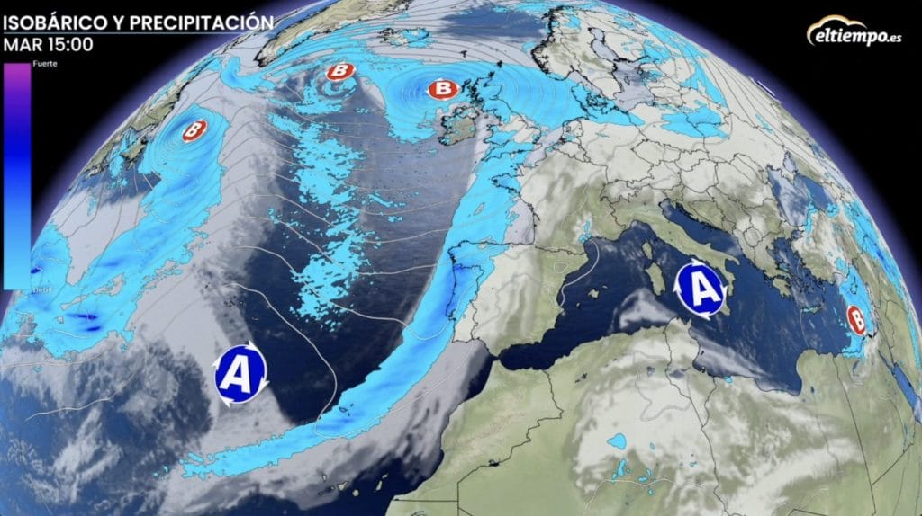 Gran parte de lo que caiga, salvo en zonas de montaña, será en forma de agua. Una vez pase el frente entre el martes y el miércoles, las altas presiones volverán a estabilizar el tiempo. Antes aún veremos lluvia que el miércoles afectará a zonas del sur y a las islas Canarias.