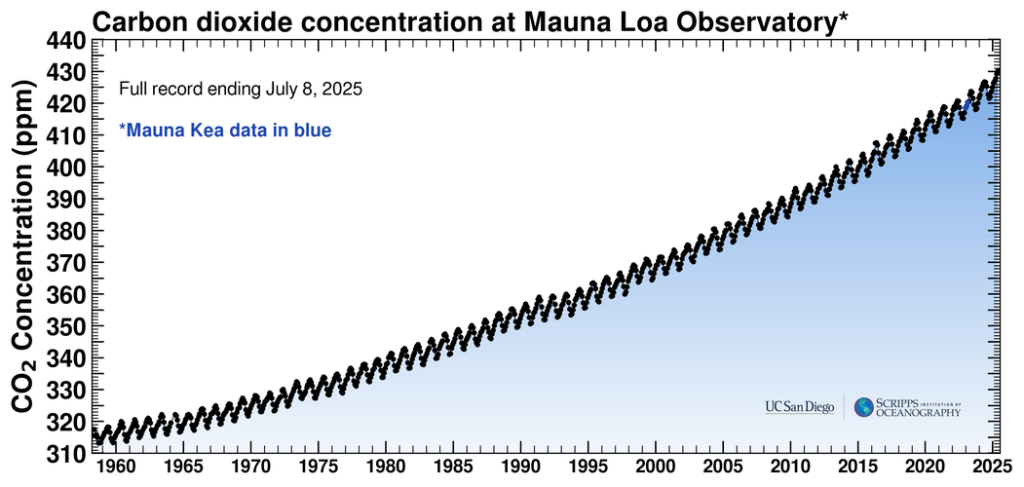 Los datos que han quedado registrados en la curva de Keeling muestran como en la década de 1960, los niveles de CO2 rondaban las 320 partes por millón. Hoy, en pleno 2025 ya superan las 420 ppm. La reconstrucción paleo-climática nos ha demostrado que no hemos tenido esas concentraciones en al menos tres millones de años. Los expertos también apuntan que la tasa de aumento supera con creces cualquier cambio natural en los últimos 50 millones de años.