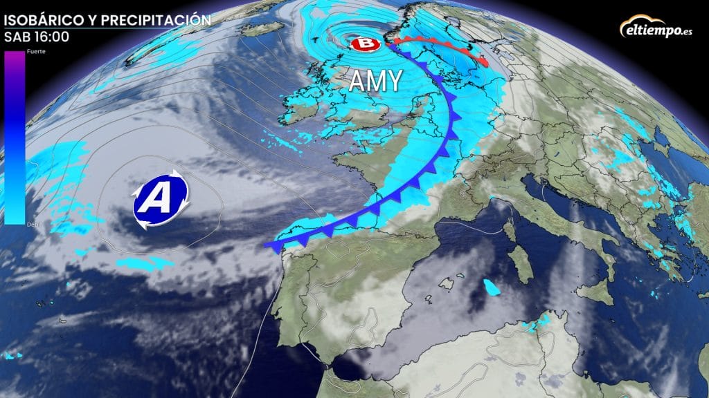 Este frente estará asociado a la borrasca Amy que circulará mucho más al norte. Esta potente borrasca afectará principalmente a las islas británicas. El frente que nos afectará, estará muy debilitado pero dejará lluvias en varias regiones de España durante el fin de semana.