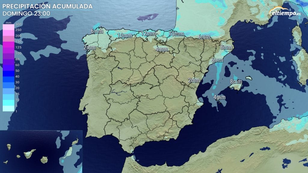 A últimas horas del día y durante la madrugada del domingo, los restos del frente, ya muy debilitado dejarían precipitaciones dispersas en puntos de la cordillera Cantábrica, alto Ebro y en Pirineos.