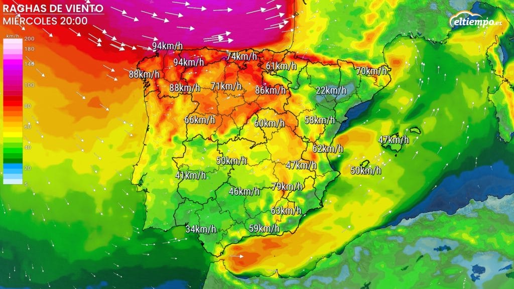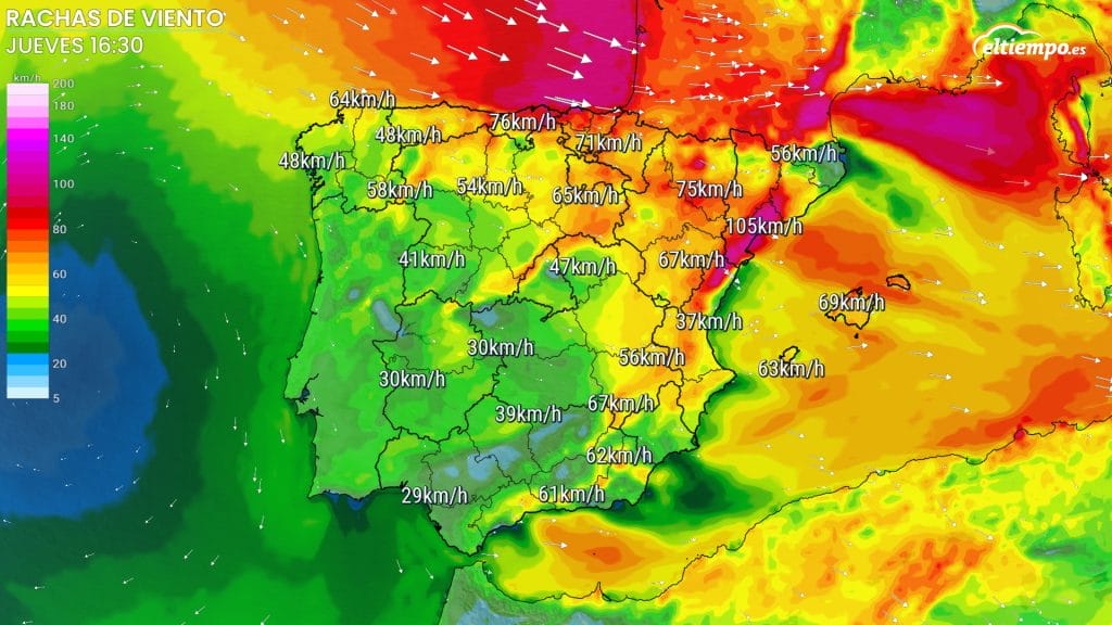 A lo largo del jueves, el frente seguirá avanzando hacia el este, lo que hará que las rachas de viento más intensas durante las primeras horas del día se concentren en la mitad este de la Península Ibérica.
