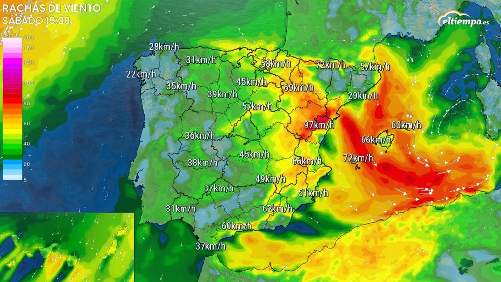 Durante la madrugada del sábado se espera que el frente y las lluvias alcancen el este peninsular y Baleares. Por la mañana se prevén lluvias en el Cantábrico oriental, área pirenaica, Aragón, Cataluña y Baleares. De forma más débil podría llover en puntos de la C. Valenciana y este de Andalucía.
