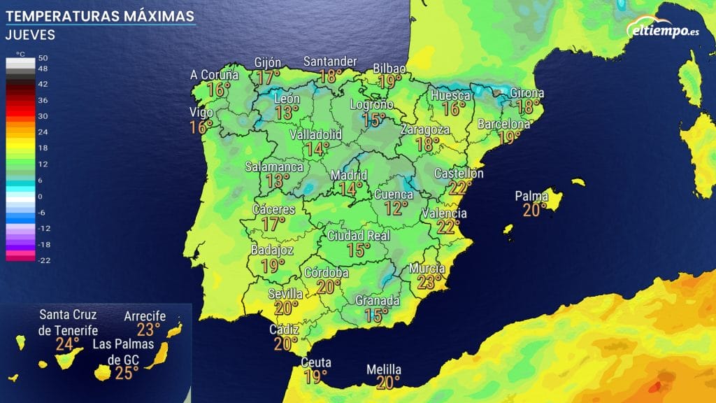 Este jueves las máximas más altas, que en general rondarán los 20-24ºC, las encontraremos en el sur de Andalucía, en las costas mediterráneas y en Canarias. En el Cantábrico oriental pueden acercarse a los 20ºC.