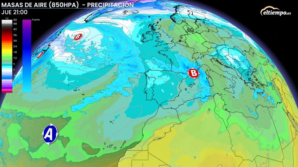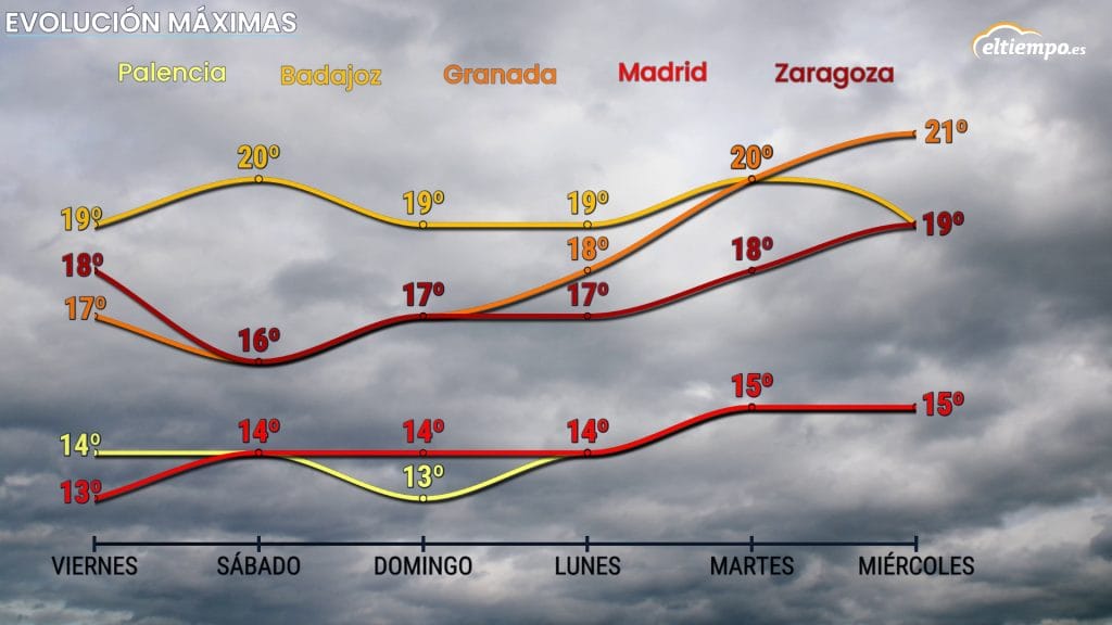 Por el contrario, en la mayor parte del interior peninsular, las máximas quedarán más cerca de los 15ºC que de los 20ºC, dejando un ambiente más fresco en el interior norte. En ciudades como León, Burgos, Salamanca, Segovia, Ávila, Soria, Cuenca o Guadalajara podrían no llegar ni a los 15ºC.