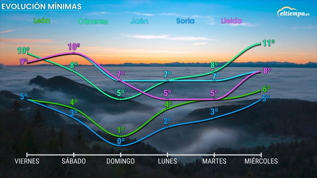 Tanto el viernes, como el sábado y sobre todo el domingo, volverán a bajar. El domingo el descenso será de nuevo generalizado. De esta manera, las temperaturas serán más frías a primera hora el fin de semana.