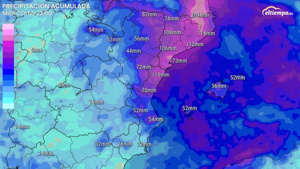 Con el paso de las horas, el miércoles las lluvias irán desplazándose hacia el sur de la costa mediterránea, con fuertes lluvias todavía en Valencia, Alicante y Murcia. Conforme vaya avanzando la jornada, las lluvias tenderán a disiparse y desaparecer, aunque podrían persistir chubascos en las Islas Baleares.