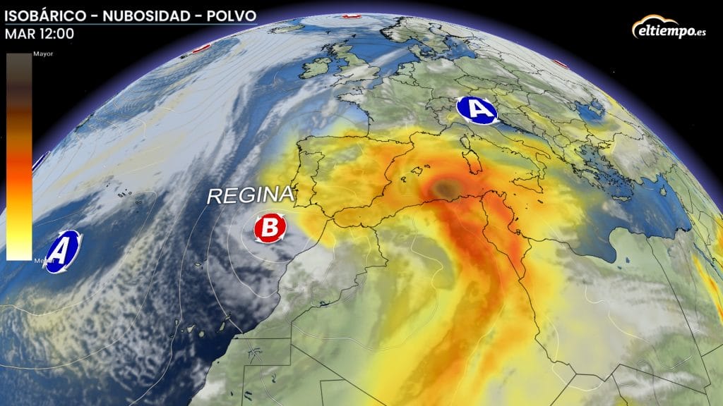La presencia de la borrasca Regina al norte de África va a favorecer la entrada de polvo en suspensión durante las próximas jornadas. Se espera que la calima afecte a buena parte del país, pudiendo dejar lluvias en forma de barro.