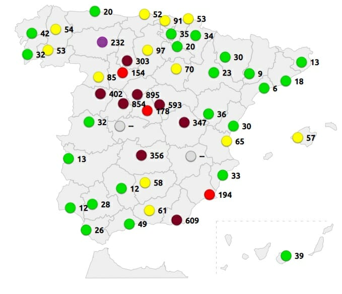 Los puntos granates, morados y rojos, tal y como vemos en el mapa de Calidad del Aire de Eltiempo.es, que señalan los niveles de calidad del aire peligrosos para nuestro organismo, están extendidos por toda la Península.