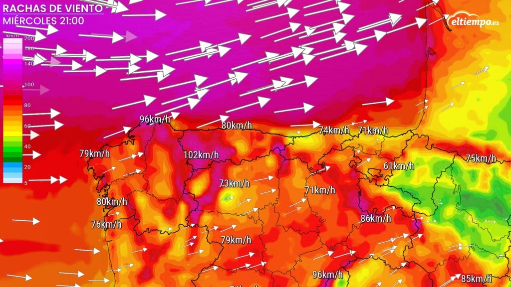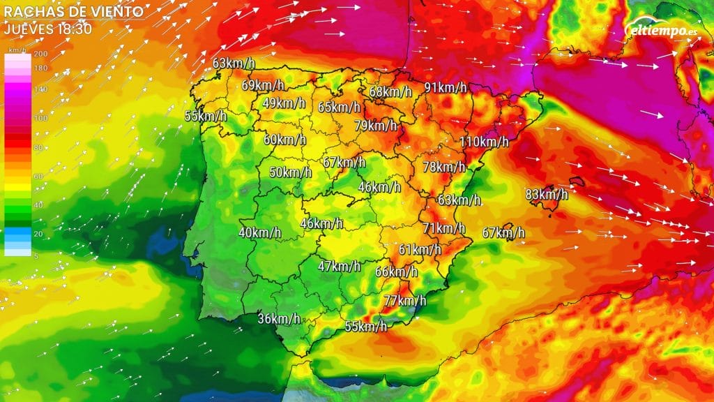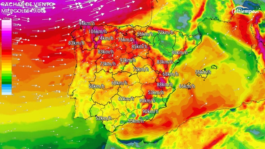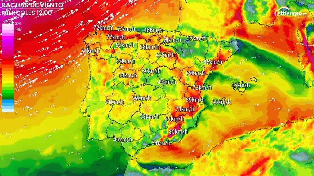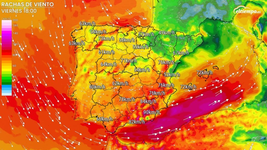 Con el paso de las horas, las fuertes rachas de viento afectarán a buena parte de la mitad norte y del este del país. Las rachas máximas se situarán en torno a los 70–80 km/h en La Rioja, Castilla y León, el norte de Madrid, Asturias, Cantabria, País Vasco, Galicia, el sur de Aragón, la Comunidad Valenciana, el este de Castilla-La Mancha, Murcia y el este de Andalucía.